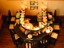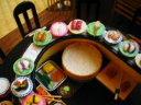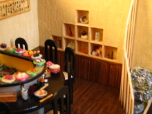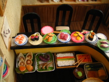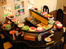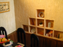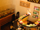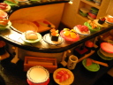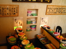 ミニチュアを始めて2つ目の作品です。 いろんなお寿司を作ったのですが、一度に全部のネタを登場させたかったので、カウンターのお寿司屋さんではなく、回転寿司屋さんになりました。 8席だけの小さな回転寿司屋さんです。 作業台には新鮮な魚介類が、レーンにはいろんなネタが回っています。 店内の一角には坪庭があります。 また、水槽には様々な貝が。壁のオブジェはオーナーの趣味が並べられています。