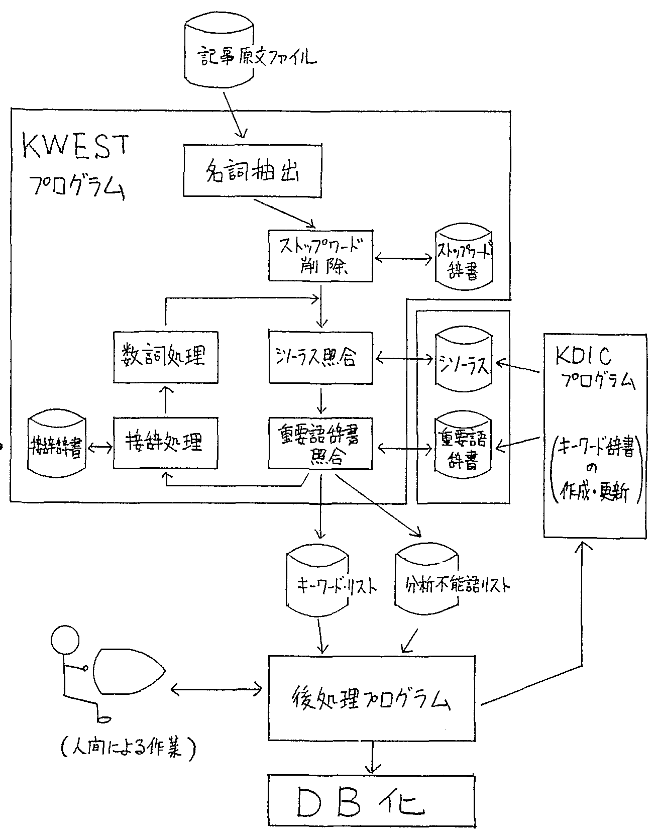 本システムは,図1に示すとおり, 入力原文からキーワード候補を抽出するプログラム(KWEST), キーワード辞書の作成をするプログラム(KDIC), および最終的にキーワード候補を人手によって選択する後処理プログラムからなる。