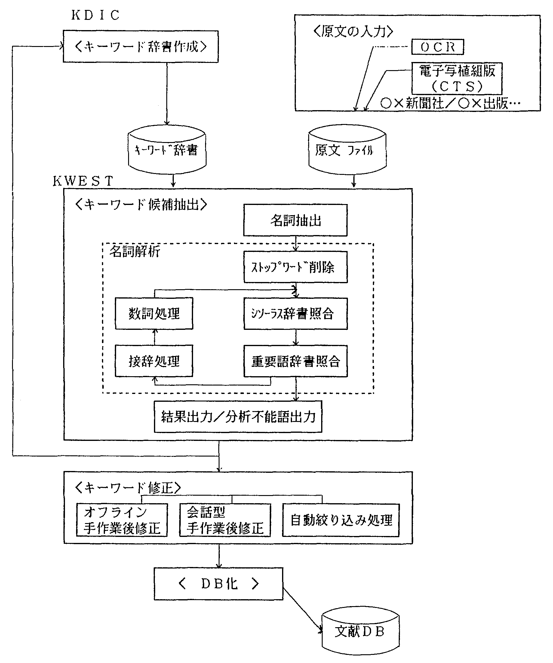 ¥¡¼¥ï¡¼¥É¼«Æ°Ãê½Ð¥·¥¹¥Æ¥à(INDEXER)¤Ï¿Þ1¤Ë¼¨¤¹¤è¤¦¤ËKWEST¤ÈKDIC¤«¤éÀ®¤êΩ¤Ä¡¥ ¤³¤Î¤¦¤ÁKWEST¤Ï¡¤ËÜ¥·¥¹¥Æ¥à¤ÎÃæ³Ë¤È¤Ê¤ë¥×¥í¥°¥é¥à¤Ç¡¤ÆþÎϤµ¤ì¤¿Ê¸½ñ¤ÎÃæ¤«¤é¡¤ ¤¢¤é¤«¤¸¤á»ØÄꤵ¤ì¤¿¥¡¼¥ï¡¼¥É¼½ñ¤È°ìÃפ·¤¿¸ì¤òÃê½Ð¤¹¤ëµ¡Ç½¤ò»ý¤Ä¤Î¤ËÂФ·¤Æ KDIC¤Ï¡¤ËÜ¥·¥¹¥Æ¥à¤Ç»ÈÍѤ¹¤ë¥¡¼¥ï¡¼¥É¼½ñ¤ÎºîÀ®¤ò¤ª¤³¤Ê¤¦¥×¥í¥°¥é¥à¤Ç¡¤ ¤¤¤º¤ì¤âDEMOS-E¾å¤Î°ì³ç½èÍýÀìÍѥ饤¥Ö¥é¥ê¡¦¥×¥í¥°¥é¥à¤Î·Á¤ÇÄ󶡤µ¤ì¤ë¡¥ ¥¡¼¥ï¡¼¥É¼½ñ¤Ï¡¤¿Í´Ö¤Ë¤è¤ë¥¡¼¥ï¡¼¥ÉÃê½Ðºî¶È¤ÎºÝ¤ËÍѤ¤¤é¤ì¤ëÀìÌçŪÃ챤ÎÃßÀѤǤ¢¤ê¡¤ ÂоݤȤ¹¤ëʸ½ñ¤Î¼ïÎà¤ä¥Ç¡¼¥¿¡¦¥Ù¡¼¥¹¤ÎÌÜŪ¤Ë¤è¤Ã¤Æ¸Ä¡¹¤ËºîÀ®¤¹¤ëɬÍפ¬¤¢¤ë¡¥ ¤¹¤Ç¤Ë¤³¤Î¥¡¼¥ï¡¼¥É¼½ñ¤ò»ý¤Ã¤Æ¤¤¤ë¾ì¹ç¤Ï¡¤¤³¤ì¤ò¥Þ¥·¥ó¡¦¥³¡¼¥É²½¤·¡¤ KDIC¤Î»ØÄꤹ¤ëñ½ã¤Ê¥Õ¥©¡¼¥Þ¥Ã¥È¤Î¥Õ¥¡¥¤¥ë¤ËÆþÎϤ¹¤ì¤Ð¡¤ KWEST¤Ç°·¤¦ÆâÉô¼½ñ¤Ë¤Þ¤ÇÊÔÀ®¤·¤Ê¤ª¤¹¤³¤È¤¬¤Ç¤¤ë¡¥ ¤Þ¤¿¡¤¤³¤Î¤è¤¦¤Ê¼½ñ¤¬Á´¤¯¤Ê¤¯¡¤ºÇ½é¤«¤éºî¤ê¤Ï¤¸¤á¤ë¾ì¹ç¤â¡¤ ¤³¤Îºî¶È¤ò»Ù±ç¤¹¤ëµ¡Ç½¤ò»ý¤Ã¤Æ¤¤¤ë¡¥ ¤µ¤é¤Ë¡¤¼½ñ¤Ë¹àÌܤò¿·¤¿¤ËÄɲä·¤¿¤êºï½ü¤·¤¿¤ê¡¤ ÆâÍÆ¤òÊѹ¹¤·¤¿¤ê¤¹¤ë¤³¤È¤â²Äǽ¤Ç¤¢¤ë¡¥ ¿Þ2¤Ë½èÍý·ë²Ì¤ÎÎã¤ò¼¨¤¹¡¥