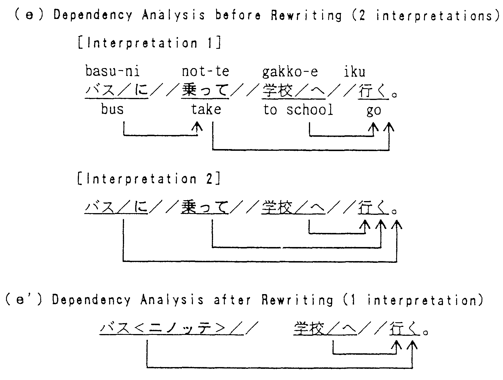 For example, in example (e) shown previously, the syntactic analysis produces two interpretations as shown in Fig. 2-(e). A rewriting rule is applied to Interpretation 1 resulting in (e'), but for Interpretation 2, it is not applicable. In such a case, correct interpretation can be easily determined by deleting the interpretation for which rules are not applicable.