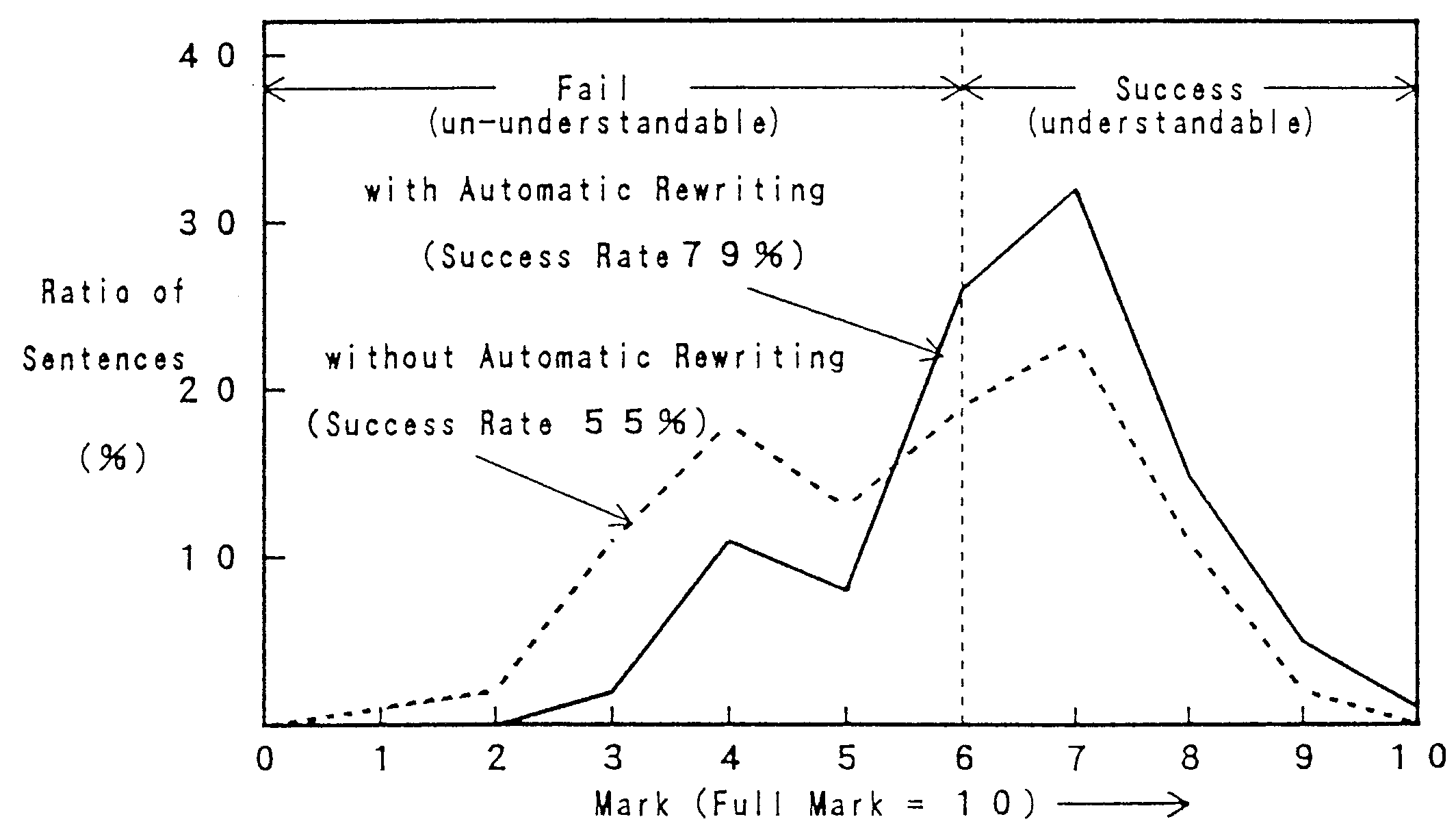 In particularly, for sentences with translation grades of 4 to 5 points (48% of total), many (15/19 = 79%) were improved to passing grades of 6 or higher. Sentences with original grades of 3 points or lower are widely affected by errors beyond the range of rewriting, but even here, the pass rate was brought to as high as (9/16 = 56%).