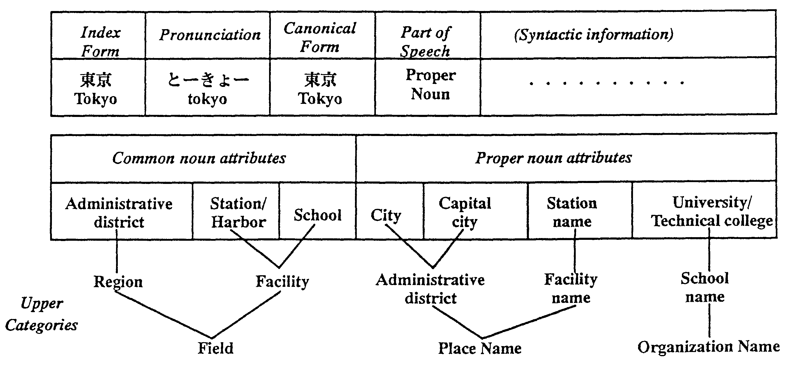 Each record has an index form, pronunciation, a canonical form, syntactic information and semantic attributes. The syntactic information includes the part of speech, inflections, detailed parts of speech, conjunctive conditions and so on. As semantic attributes, it can have five common noun attributes and ten proper noun attributes. In the case of "Tokyo", there are three common noun attributes and four proper noun attributes. The average number of attributes is two.