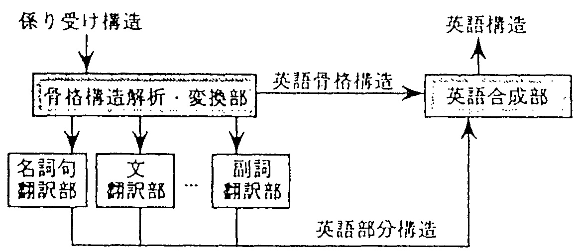 係り受け解析された日本文は、「骨格構造解析・変換部」でルールと照応され、 骨格溝造と部分横造に分割される。 骨格構造に対しては直接英文構造が出力され、部分構造は、 その種類に応して従来の翻訳処理が実行される。英語合成部で両者を合成し、訳文とする。