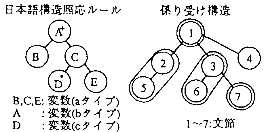 係り受け関係は、各ノードに文節がある本構造として表現できる。 これと照応できるように、各ノードに変数を持つルールを用意する。 変数の値は係り受け木構造の一部分である。各ルールはそれぞれが英文生成規則を持つ。