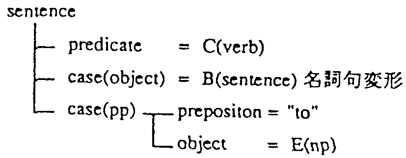 (a)の変数には名詞句、文などの型が指定されてあり、 それぞれの型に応じて、従来の翻訳処理で翻択される。