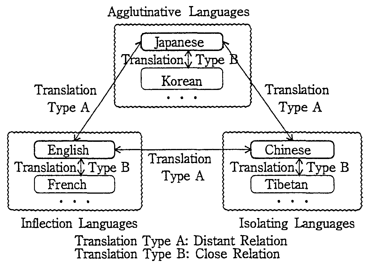 We propose a new multi-lingual translation method based on the use of representative languages. The method is shown in Fig. 1. In this method, translation is conducted as follows. First, languages close to each other are collected into discrete language groups. This paper introduces three language groups: the agglutinative language group, the inflection language group and the isolating language group. Next, a representative language is selected for each group. There are two types of translations.