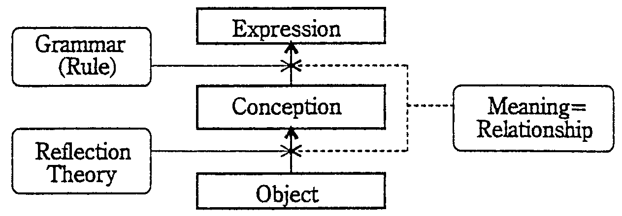 Past research often misunderstood the relation between rules and meanings. The so called word meanings usually registered in dictionaries should be regarded as word usages, namely the linguistic rules. Meanings appear only when the rules are used in expressions. Here, we separate the conventional meaning processing into two processes as shown in Fig.3. One is the process of semantic analysis which specifies the rule used in constructing the actual expression. The other process is called meaning understanding which specifies the relations between expressions and objects in the world.