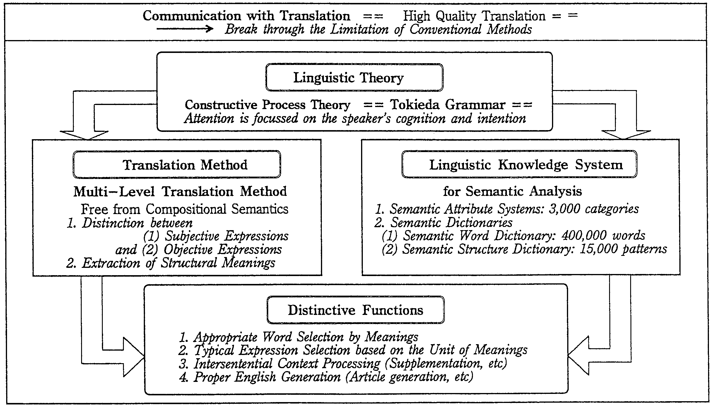 Based on the idea mentioned above, we proposed a Multi-Level Translation Method (MLT method) supported by semantic analysis. And the Japanese to English MT System, ALT-J/E (13,14), was developed to evaluate the effects of the method. The relation between the theoretical background of ALT-J/E, translation method, linguistic knowledge systems and prominent functions achieved by them are described in Fig.4.