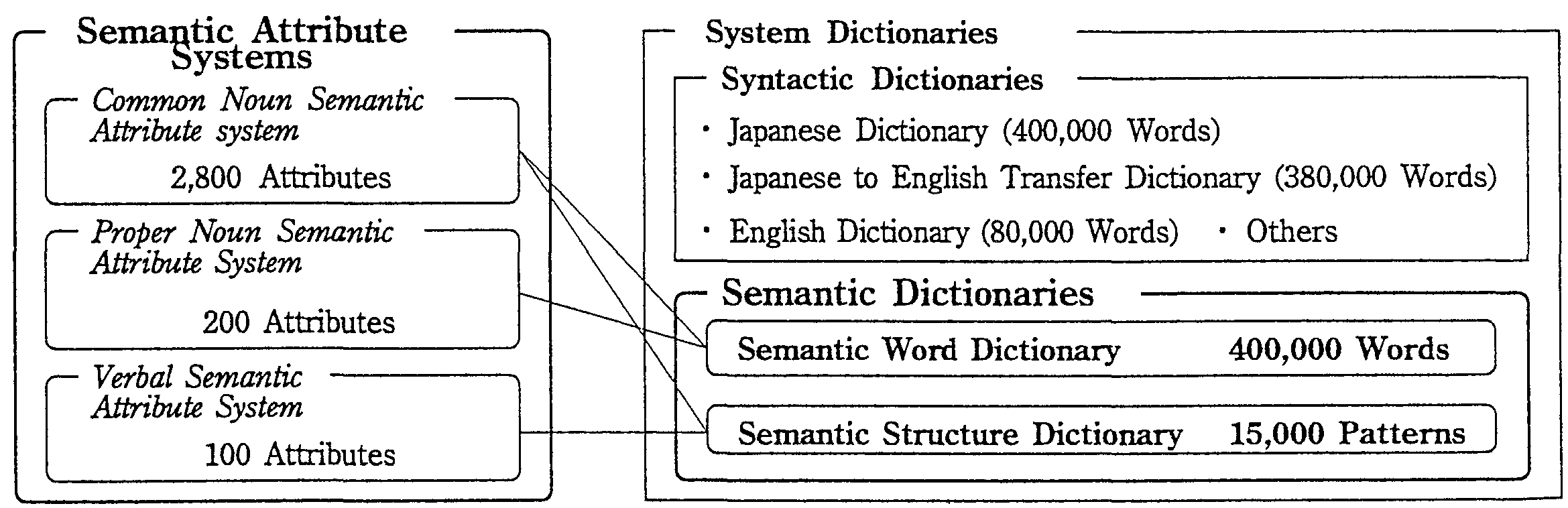 Up to now, researches into natural language processing (NLP) has been conducted using mainly the results of the computational linguistics (10) such as a generative grammar and a phrase structure analysis. Most MT systems that were developed in Japan in the 1980s were founded on these theories. The interlingual method mentioned before uses the dualism of syntax and semantics.