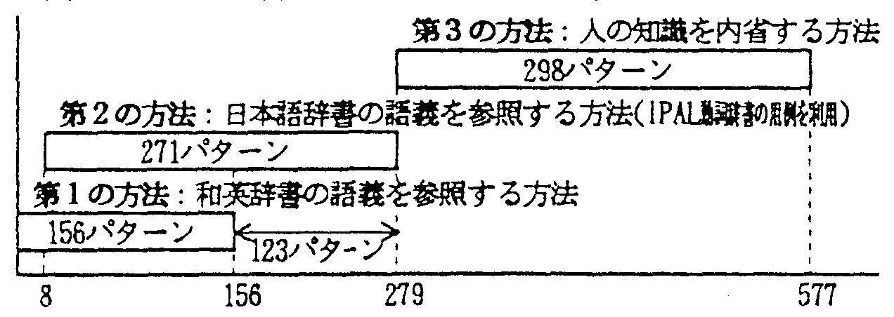 ¤³¤ì¤é¤ÎÌäÂê¤ò²ò·è¤¹¤ë¤¿¤á¡¤ ËÜÏÀʸ¤Ç¤Ï¡¤¿ÍÍѤμ½ñ¤ÎÃμ±¤È¿Í¤ÎÃ챤òÆâ¾Ê¤¹¤ëÊýË¡¤ÇºîÀ®¤·¤¿ÍÑÎã¤ò»ÈÍѤ·¤Æ¡¤ ÏÂ¸ìÆ°»ì¤Î°ìÉô¤òÂоݤ˥ѥ¿¡¼¥óÂФκîÀ®¼Â¸³¤ò¹Ô¤Ã¤¿¡£ ¶ñÂÎŪ¤Ë¤Ï¡¤(1)ϱѼ½ñ¤«¤é¼ý½¸¤¹¤ëÊýË¡¡¤ (2)ϱѼ½ñ¤Ë²Ã¤¨ÆüËÜ¸ìÆ°»ì¤Î¸ìµÁÂбþ¤ÎÍÑÎã¤ò»ÈÍѤ¹¤ëÊýË¡¡¤ (3)¤½¤ì¤é¤ò»²¹Í¤Ë¿Í¤ÎÃμ±¤Ë´ð¤Å¤¤¤ÆÍÑÎã¤òºîÀ®¤¹¤ëÊýË¡¡¤¤Î£³¼ï¤ÎÊýË¡¤ò¼è¤ê¾å¤²¡¤ 30¼ï¤ÎÏÂ¸ìÆ°»ì¤ËÂФ¹¤ë¥Ñ¥¿¡¼¥óÂФοô¤òÈæ³Ó¤·¤¿¡£ ¤½¤Î·ë²Ì¡¤(2)¤ÎÊýË¡¤Ï(1)¤ÎÊýË¡¤ÎÌó£²ÇÜ¡¤ (3)¤ÎÊýË¡¤Ï¤µ¤é¤Ë¤½¤Î£²ÇܤΥѥ¿¡¼¥óÂФ¬¼ý½¸¤Ç¤¤ë¤³¤È¤¬Ê¬¤«¤Ã¤¿¡£ ¤Þ¤¿¡¤Æü±Ñµ¡³£ËÝÌõ¤Ë¤ª¤¤¤ÆÌõ¤·Ê¬¤±¤ÎɬÍפÊÌó1,000¼ï¤ÎÏÂ¸ìÆ°»ì¤ËÂФ· Ìó7,500·ï¤Î¥Ñ¥¿¡¼¥óÂФ¬É¬ÍפǤ¢¤ê¡¤ ¤½¤ì¤òºîÀ®¤¹¤ë¤Ë¤Ï15,000·ï¤ÎÍÑÎã¼ý½¸¤¬É¬ÍפǤ¢¤ë¤³¤È¤Ê¤É¤¬Ê¬¤«¤Ã¤¿¡£