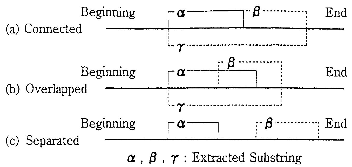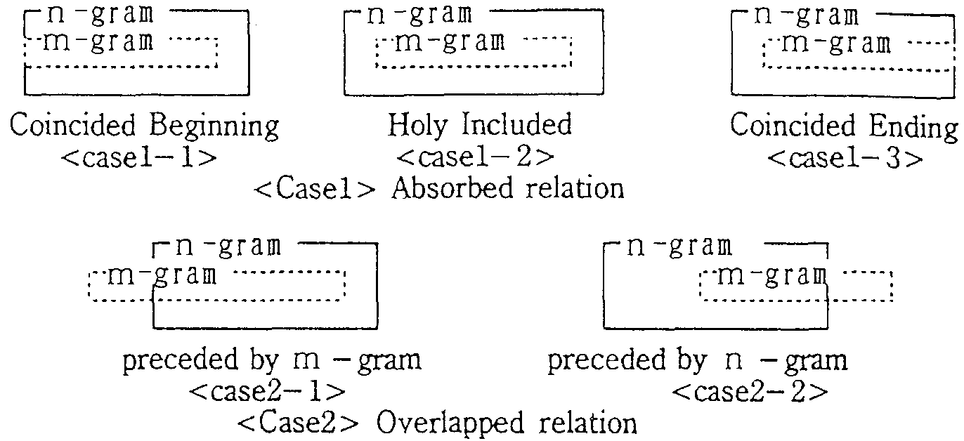 The Case of Absorbed Relation (Case 1) can be classified into three sub-cases as shown, but regardless of which situation, the m-gram substring is absorbed in the substring of n-gram and therefore there is no need to extract such a m-grarn substring. Thus, when extracting n-gram strings, there is a need to invalidate the related record of the SPT so that m-gram strings do not become involved in processes to follow.