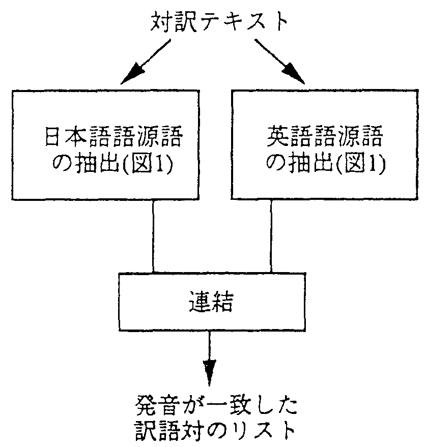 本方式で抽出されるのは、発音が一致する語であるから、 元々どちらかの言語の言葉であったものを、他方に軸入した語である。 しかし、語源がどちらの言語にあるかによって発音が異なる場合がある。 例えば、“make”は英語の発音では[meik]であるが、 この語が日本語からの輸入語であれば、[マケ]となる。 そのために、日本語語源の対訳と英語語源の対訳を別々に抽出し、 双方から得られた対訳リストを後に連結することとする(図2)。