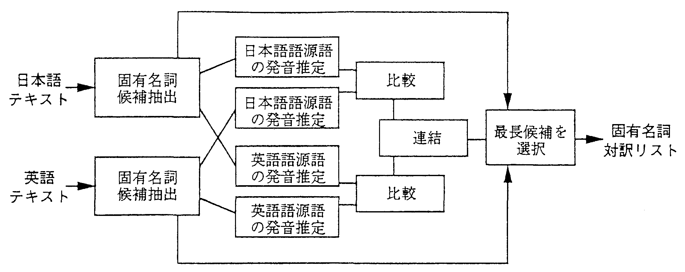 ここまでの段階で抽出されるのは、発音が一致した部分である。 しかし、固有名詞対訳辞書を作成することを考えると、 発音が一致しない部分も合めて辞書登録されている方が好ましい。 例えば、“三菱自動車”の英語名は“Mitsubishi Motors”である。 この場合、発音一致の手法で抽出されるのは“三菱”と“Mitsubishi”であるが、 固有名詞辞書には、 “三菱自動車”と“Mitsubishi Motors”で登録された方が望ましいと考えられる。 そのために、発音が一致した部分をキーにして、もう一度固有名詞候補を倹索し、 そのキーを含む最長の固有名詞候補を最終的な訳語対として出力することとする。 したがって、システム全体の構成は図3の通りとなる。