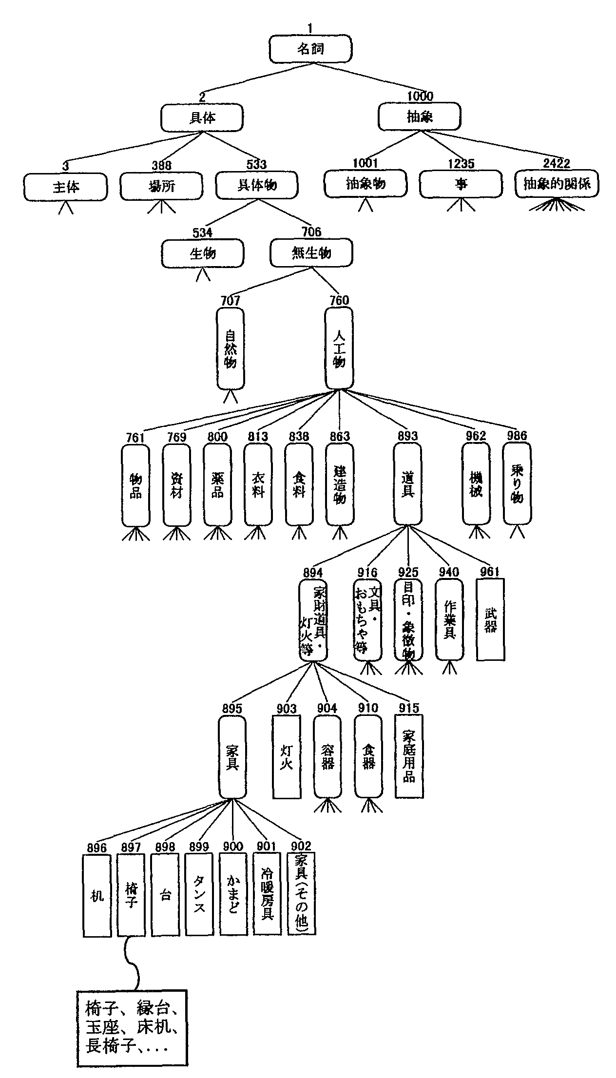 機械翻訳でも同様のことをやりたいのですが、 コンピュータは「ぼく」と「あなた」の共通性などは知りません。 そこで、同義語や共通性のある語をあらかじめ束ねておいたもの、 シソーラスを使って類似判定を行ないます。 シソーラスは、単に単語をグループ化するだけでなく、 共通性の度合いに応じて段階的に大きなグループにまとめられています。 類似性の判定では、このグループの離れ方で類似度を測ります。 例えば、図のようにシソーラスが作られているとします。 「椅子」と「縁台」は距離0、「椅子」グループと「家具」グループは距離1、 「椅子」グループと「机」グループは距雑2などとなります。