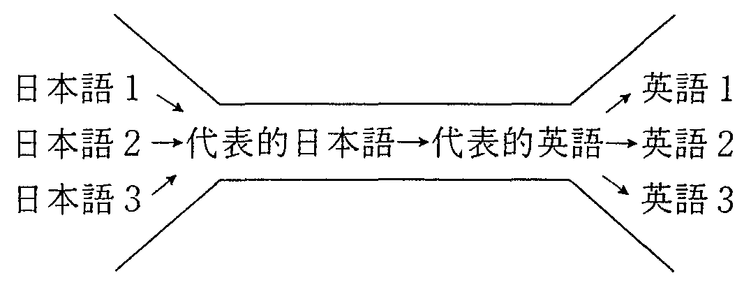 ここから先は筆者の推測に過ぎませんが、 おそらく日本語の表現のバリエーション、英語の表現のバリエーションが 翻訳家の頭の中には無意識のうちに整理されているのではないでしょうか。 そして、ある表現を代表的な表現に置き換え、その代表的な表現の日英を対応付け、 そして英語の表現のバリエーションに展開する、 そのようにして翻訳しているのではないでしょうか。 もちろん、代表的な表現の日英対応づけされたもの自体を、 一般の人よりはるかに豊富に蓄えているでしょうけれど。