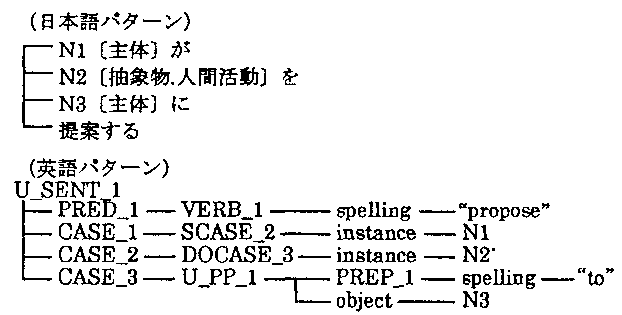 構文意味辞書には, 日本語と英語の結合価パターンが対にして記述されている。 このため, 日英機械翻訳の意味解析において 日本語パターンが選択された時点で英語のパターンも決定されることになり, 構文に関しては改めて変換の必要がないという特徴がある。 構文意味辞書では, 論理的には, 例えば次のようなパターン対の構造が記述されている。