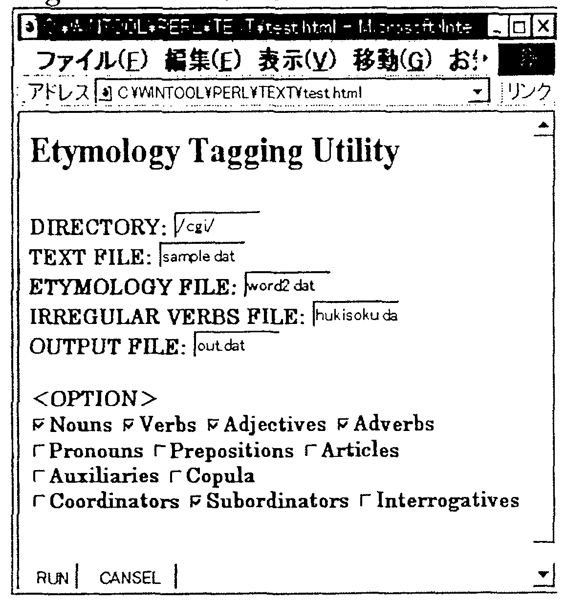 Utility includes a tagging program, a user interface, and database files of the etymology. The tagging program is implemented in using PERL and the user interface is available in CGI, as shown in Figure 2. The CGI interface allows the user to select a desired text and run the tagging program. The user can select optional labels by marking check boxes. Thus, the user can choose word classes such as Nouns, Verbs, Adjectives, Adverbs, Pronouns, Prepositions, Articles, Auxiliaries, Copula, Coordinates, Subordinates, and Interrogates to be tagged with the etymological labels.