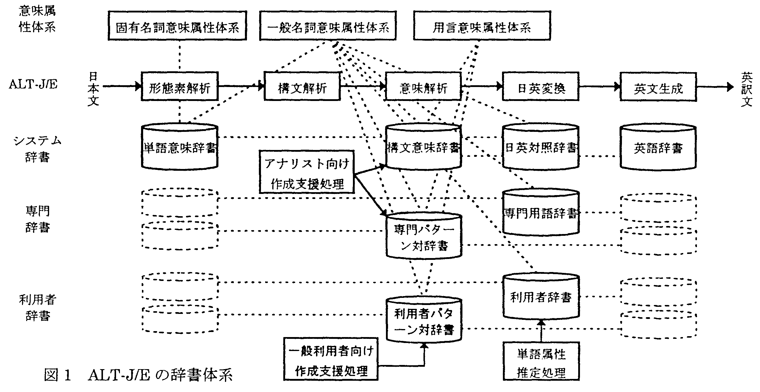 ALT-J/E ¤Ç»ÈÍѤµ¤ì¤ë°ìÈÌ̾»ì°Ọ̃°ÀÂηϤÏ, ̾»ì¤òÌó2,700 ¼ïÎà¤ËʬÎàÂηϲ½¤µ¤ì¤Æ¤¤¤ë[ÃÓ¸¶97]¡£ ¤³¤ì¤ò°ìÈÌÍøÍѼԤ¬»È¤¤¤³¤Ê¤¹¤Î¤ÏÆñ¤·¤¯, ñ¤ËÍøÍѼԼ½ñ¤ËÌõ¸ìÂФòÅÐÏ¿¤·¤Æ¤âµÑ¤Ã¤ÆÌõʸ ÉʼÁ¤¬Äã²¼¤¹¤ë¾ì¹ç¤¬¤¢¤Ã¤¿¡£¤³¤ì¤Ï´û¸ñ¸ì¤È¤Î À°¹çÀ¤¬Êø¤ì¤ë¤Î¤¬¼ç¤Ê¸¶°ø¤Ç, °ìÈÌÍøÍѼԤˤâŬ ÀڤʰỌ̃°À¤òÍÆ°×¤ËÉÕÍ¿¤Ç¤¤ë¤è¤¦¤Ê´Ä¶¤òÍÑ °Õ¤¹¤ëɬÍפ¬¤¢¤Ã¤¿¡£ ¤½¤³¤Ç, Æü±Ñ¤ÎÌõ¸ìÂФòÆþÎÏ ¤Ë¤·¤Æ, ¥·¥¹¥Æ¥à¼½ñ¤ÎÎà»÷ɽ¸½¤ò»²¹Í¤Ë¤·¤Æ°ÕÌ£ °À¤ò¿äÄꤹ¤ë½èÍý¤ò¼Â¸½¤·¤¿¤È¤³¤í, ¥¢¥Ê¥ê¥¹¥È ¤È¤Û¤ÜƱÅù¤ÎÀºÅ٤ǰỌ̃°À¤¬ÉÕÍ¿¤µ¤ì¤ë¤è¤¦¤Ë ¤Ê¤ê, ÍøÍѼԤÎÂçÉý¤ÊÉéô·Ú¸º¤¬²Äǽ¤Ë¤Ê¤Ã¤Æ¤¤¤ë [ÃÓ¸¶95]¡£