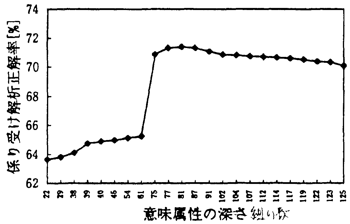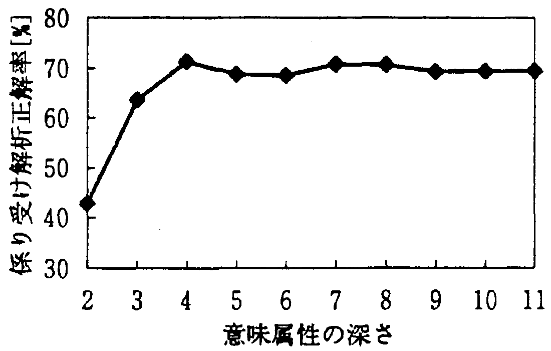 図1 に意味属性体系の深さ ( その深さにある意味属 性を使用する) と係り受け正解率の関係を示す。この図 より、正解率のピークは深さ3 (意味属性数:21) から深 さ5 (意味属性数:256) の間にあることが分かる。