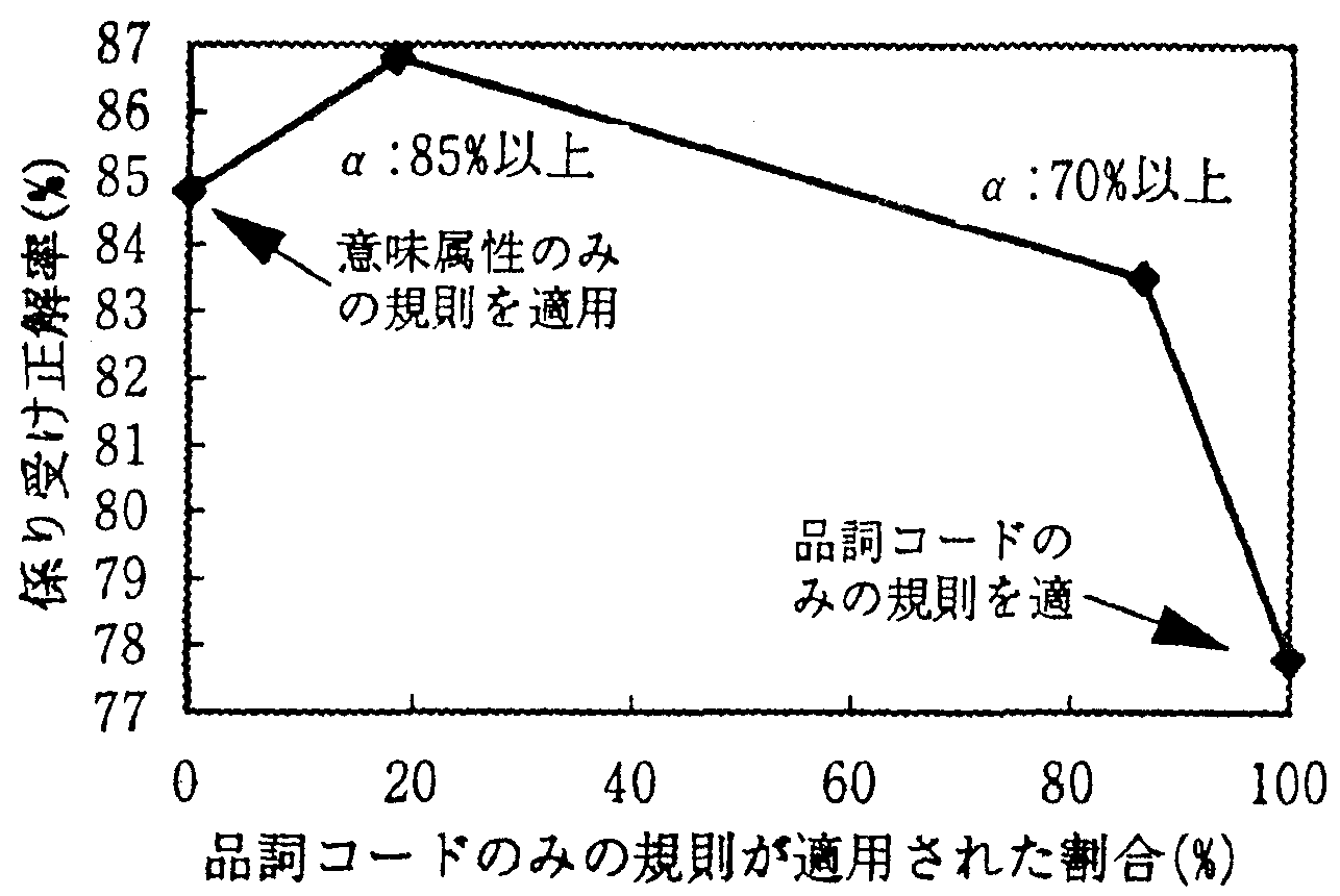 図1に品詞コードのみの規則と意味属性のみの 規則の適用の割合を変化させたときの係り受け解析 正解率の変化を示す。ここで、品詞コードと意味属 性を混合した係り受け規則は同格を含む用例を抽出 する目的で、一番初めに適用される。