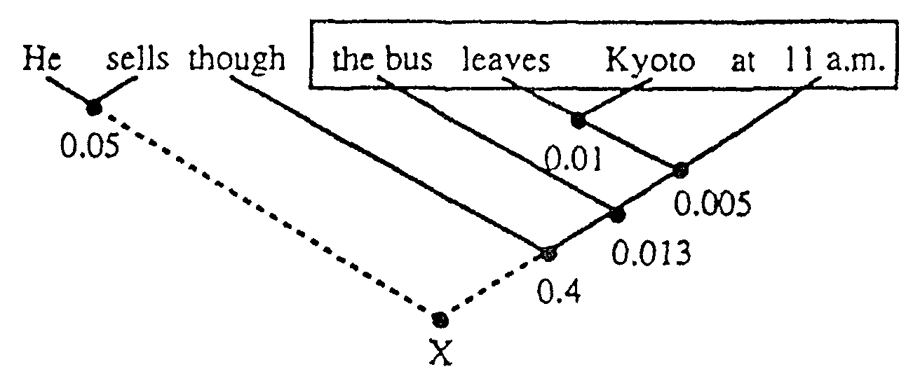 Figure 1 shows an example of Partial Translation in an English-to-Japanese (EJ) translation. The input sentence "He says the bus leaves Kyoto at 11 a.m." is recognized as "He sells though the bus leaves Kyoto at 11 a.m.." The solid lines in Figure 1 indicate dependency structures and the real number for each structure denotes the corresponding semantic distance value. The dotted line indicates the failure. In this example. the analysis of the whole sentence fails due to the misrecognition "sell though." The distance value of the longest part, "though the bus leavcs Kyoto at 11 a.m.," is thought to include erroneous words because the distance value 0.4 is larger than threshold value A. Then, we step to the next longest part "the bus leaves Kyoto at 11 a.m.." This part is extracted as a correct part, because the distance 0.013 is under threshold value A. The isolated part "He sells" is also evaluated. The distance of the part. "He sells" is under threshold value A, but the part includes only two words under threshold B, so the part "He sells" is regarded as erroneous.