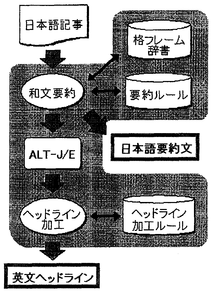 このように, ヘッドライン自動生成システムは日本文新聞記事の本文を入力すると, それを1文に要約して日本語要約文と英文ヘッドラインを出力する.