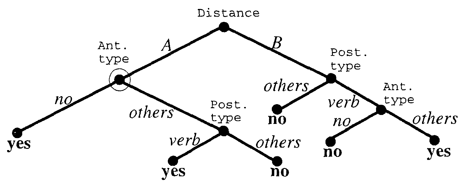 Let us first consider the single tree case. We slightly changed C4.5 (QuinIan, 1993) programs to be able to extract class frequencies at every node in the decision tree because our task is regression rather than classification. Figure 3 is the simplified and unpruned decision tree generated from the training data shown in Table 3. Each node and edge in the tree is labeled with a feature name and its value, respectively. They indicate that the data are split by the feature according to its values. The feature and values are selected so as to maximally separate class labels of the data. The finally separated class values are attached to each leaf node of the tree. In the current example, the decision tree first selects the feature Distance at the top node. If its value is A and the value ofthe next feature anterior type is no, the class of data is then determined as yes. The rest of the data can be correctly classified in the same way. Note here that we can extract the class frequencies from each node. For example, the circled node of depth 1 stores five examples of Table 3 whose distance values are A. The class frequency at this node is (yes, no) = (3, 2). We can therefore compute at this node the probability of yes as 3/(3 + 2) = 0.6.