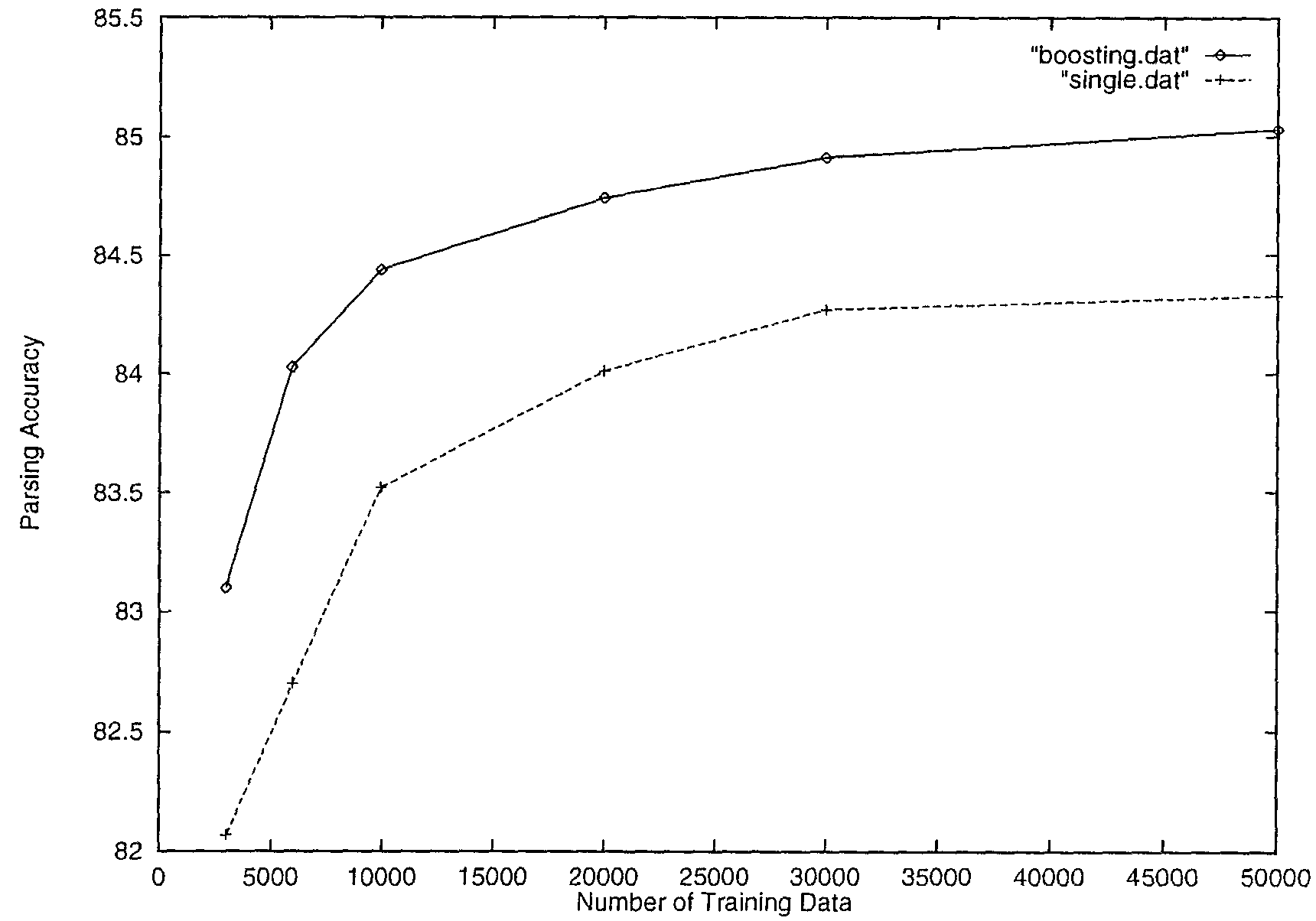 This section reports experimental results on the boosting version of our parser. In all experiments, pruning confidence levels were set to 55%. Table 8 and figure 6 show the parsing accuracy when the number of training examples was increased. Because the number of iterations in each data set changed between 5 and 8, we will show the accuracy by combining the first five decision trees. In figure 6, the dotted line plots the learning of the single tree case (identical to figure 5) for reader convenience. The characteristics of the boosted version can be summarized as follows compared to the single tree version.