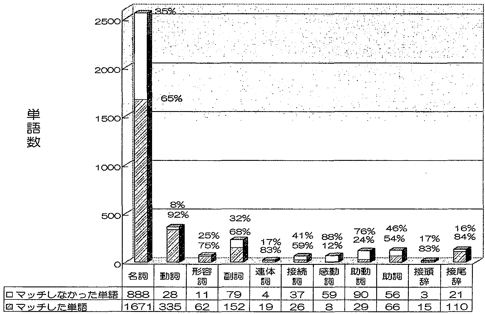 図1の例では、格助詞「の」、準体助詞「の」、 連体助詞「の」は日本語語彙大系やALT-J/Eに同等とみなせる語彙項目が含まれていると判断できた。 しかし、終助詞「の」は日本語語彙大系やALT-J/Eには含まれていなかった。 したがって、異なり語数を基準とする被覆率は3/4となり、75.0%である。 延べ語数を基準とする被覆率は4541/4545となり、99.9%である。